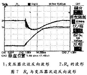 R1實際值很小,可以忽略。穩壓二極管並聯在D1,C1兩端,它的電壓是D1和C1兩端電壓之和。穩壓二極管是隨電流大小自動調整的“可變”電阻。通過改變電阻來控製上升沿和下降沿的速率,從而達到控製過衝尖峰的大小。實測Rg與驅動變壓器次邊反向波形如圖7所示。Rg上電壓波形即為勵磁電感上流過的電流波形。正脈衝下降沿的過衝尖峰由勵磁電感造成的: