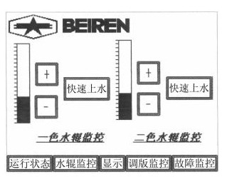 在人機界麵中,設計了7幅(fu)畫(hua)麵(mian),包(bao)括(kuo)整(zheng)體(ti)圖(tu)形(xing),故(gu)障(zhang)顯(xian)示(shi),機(ji)器(qi)速(su)度(du)和(he)計(ji)數(shu)顯(xian)示(shi),水(shui)輥(gun)速(su)度(du)顯(xian)示(shi),調(tiao)版(ban)監(jian)控(kong)等(deng)。故(gu)障(zhang)顯(xian)示(shi)使(shi)用(yong)指(zhi)示(shi)器(qi),給(gei)出(chu)位(wei)元(yuan)件(jian)即(ji)可(ke)實(shi)現(xian)閃(shan)動(dong)效(xiao)果(guo),讓(rang)操(cao)作(zuo)者(zhe)很(hen)方(fang)便(bian)的(de)知(zhi)道(dao)故(gu)障(zhang)部(bu)位(wei),整(zheng)體(ti)感(gan)很(hen)好(hao)。在(zai)水(shui)輥(gun)速(su)度(du)顯(xian)示(shi)中(zhong),設(she)計(ji)了(le)一(yi)個(ge)柱(zhu)狀(zhuang)圖(tu),可(ke)以(yi)顯(xian)示(shi)水(shui)量(liang)增(zeng)加(jia)大(da)小(xiao),隻(zhi)需(xu)按(an)下(xia)柱(zhu)狀(zhuang)圖(tu),就(jiu)可(ke)增(zeng)加(jia)水(shui)量(liang),同(tong)時(shi)也(ye)可(ke)方(fang)便(bian)監(jian)控(kong)。如(ru)圖(tu)所(suo)示(shi):