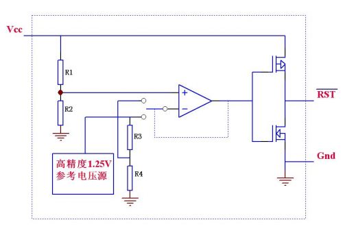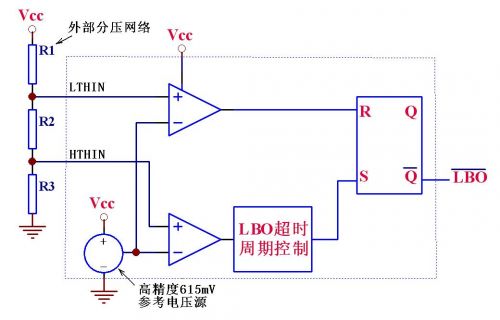 IC內含一個高精度的615mV基準電壓源、兩個比較器、一個RS觸發器和其它一些邏輯電路,其大致功能是:VCC電壓或其它待檢測電壓通過R1-R3組成的分壓網絡接在IC的LTHIN /HTHIN檢測引腳,當待測電壓下降導致LTHIN引腳低於615mV時,輸出腳LBO輸出低電平,而如果待測電壓上升導致HTHIN引腳高於615 mV時,經過內部邏輯判斷和簡單延時後,輸出腳LBO輸出高電平。