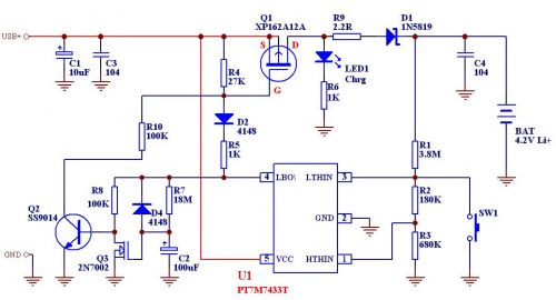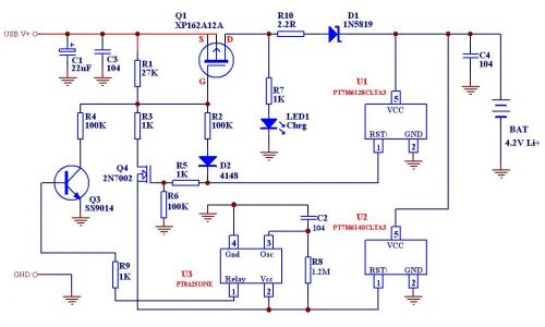 PT7M7433T是上海百利通公司最新設計的極高精度的一係列電壓檢測器的其中一款,其檢測精度在0-Vcc (5.5V)範圍內小於1mV,而且其批量IC的檢測值偏差<±2.5%,這樣完全保證了批量產品的性能一致性和極高的總體性能,我們利用其配合少量外部電路即可組成相當簡單的鋰電池充電線路。