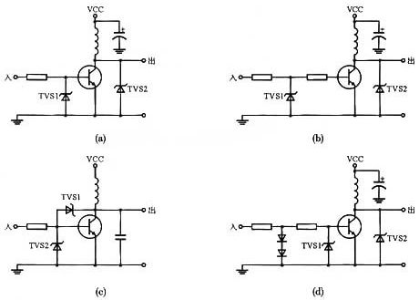 各種瞬變電壓能使晶體管的EB結或CE結擊穿而損壞,特別是晶體管集電極有感性(線圈、變壓器、電動機)負載時,通常會產生高壓反電勢,因而可能使晶體管損壞。在實際應用中,建議采用TVS作為保護器件。圖3所示為TVS保護晶體管的四種電路實例。