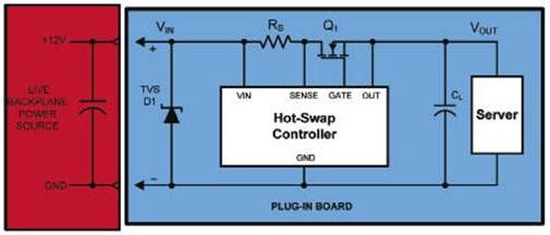 在熱插拔應用中,TVSzhuyaoyongzuoxuyaobeizhongduandechamodianliudejiedifenliulujing。rechabaxitongchangbeiyongzaifenbushidianyuanxitongzhongtigongkekaodexitongbaohuhedianqiguanli,dianxingfuwuqixitongdexiankajiekouherechabadianluyuanliturutu5所示。
