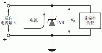 在反向電源輸入模式中,電源線電壓與TVS VF的電壓相同,這種反偏模式會引起電子線路故障,外延型TVS的低正向壓降能夠很好地解決這個問題,如圖8所示。