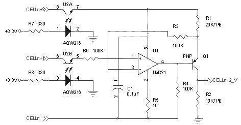 由於本文實驗中采用的采樣電路參考電壓為2.5V,因此需要把電池電壓進行2倍衰減,所以選擇了R1=2R2,電路中電容C1為去耦電容,電阻R5為限流電阻,電阻R4用於保證電路可靠工作,為了減少電壓檢測電路的漏電流,在每節單體電池電壓檢測線上加入AQW216光電繼電器作為檢測控製開關,如圖2suoshi,dangxuyaojiancedianchidianyashi,tongguokongzhiduandakaiguangdianjidianqi,jiancewanguanbiguangdianjidianqi,keyouxiaojianshaojianceshideloudianliuduidianchizuyizhixingdeyingxiang。