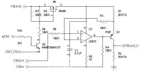 dianliuxingdianyajiancedianluceliangjingdugao,danyecunzaizheyidingdequexian,shouxianweileceliangjingdugao,bixujinkenengdejianxiaodianzuduidezuzhi,zhebiranzengjialejiancedianludeloudianliu;其次為了滿足電路中的MOSFET管能正常作用,電路中運放的反向輸入端與係統地之間的電壓一般要大於3V以上,由於單體電池電壓一般在2.0V~4.2V之間,因此為了滿足要求必須用於兩節單體電池以上,對於電池組中靠近係統地的兩節單體電池無法用此方法進行測量。