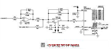 該電路中,YO-LOW-FM是低頻誤差電壓,範圍為±5V之內,為了將輸入電壓調整到A/D的要求範圍內,需加由R70、R71、N27-A組成的直流偏壓電路。在此,采用8位A/D轉換器,對誤差電壓的采樣分辨率可以達到40mV以內,按照低頻誤差電壓調諧靈敏度為10MHz/V計算,理論上對於YTO預置誤差的采樣分辨率可以達到0.4MHz以內,相對於YTO的捕獲帶寬而言,完全滿足采樣精度要求。