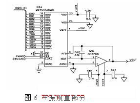 在主振預置電路D/A部分,為了照顧2-20GHz全頻段能有較為精細的預置分辨率,並且滿足△Data插值需要,在此選擇了14位D/A轉換器,使用時在數據範圍0~16383兩端預留一定的插值空間,電路如圖6所示。