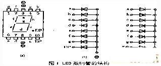 常見LED數碼管的外形及內部結構如圖1所示。圖1(b)屬於共陽極結構,圖1(c)采用共陰極結構。+、一分別表示公共陽極和公共陰極。a~g是7個筆段電極,DP為小數點。另有一種字高為7.6mm的超小型LED數碼管,管腳從左右兩排引出,小數點則是獨立的。