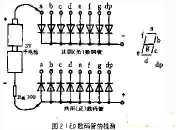 LED數碼管外觀要求顏色均勻、無局部變色及無氣泡等,在業餘條件下可用幹電池進一步檢測。如圖2所示。以共陰極數碼管為例介紹檢測方法。;將3;V幹電池負極引出線固定接觸在LED數碼管的公共陰極上,電池正極引出線依次移動接觸筆畫的正極端。這一根引出線接觸到某一筆畫的正極端時,那~筆畫就應顯示出來。用這種簡單的方法就可檢測出數碼管是否有斷筆(某筆畫不能顯示),連筆(某些筆畫連在一起),並且可相對比較出不同的筆畫發光的強弱性能。若檢測共陽極數碼管,隻需將電池正負極引出線對調一下,方法同上。