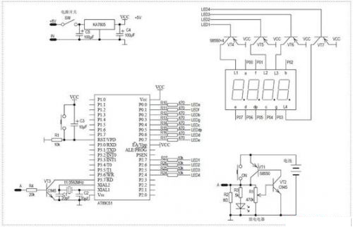 在實際電路中,L1就是第一隻數碼管的共陽極端。單片機的輸出、輸入接口數量都很有限,所以4位LED數碼管驅動都是使用動態顯示的方式。4隻獨立數碼管LED的內部a、b、c、d、e、f、g、dp這8段發光管相對應的陰極都是並連的。統一由單片機P0口8位輸出進行驅動。數碼管要顯示出數碼還必須在共陽極端同時施加正電壓才行。所以要讓4位中某一數碼管進行顯示,隻要在P0口kou輸shu出chu字zi型xing碼ma的de同tong時shi,給gei這zhe位wei數shu碼ma管guan共gong陽yang極ji端duan加jia上shang正zheng電dian壓ya就jiu行xing了le,當dang然ran與yu此ci同tong時shi其qi他ta三san位wei數shu碼ma管guan的de共gong陽yang極ji端duan要yao保bao持chi低di電dian壓ya,才cai不bu致zhi顯xian示shi出chu現xian混hun亂luan。數shu碼ma管guan共gong陽yang極ji端duan驅qu動dong電dian流liu較jiao大da,所suo以yi采cai用yong了le三san極ji管guan進jin行xing控kong製zhi。以yi第di一yi隻zhi數shu碼ma管guan為wei例li,在zaiP0端口輸出字型碼的同時,P37輸出低電平,三極管T4導通,則共陽極端L1就得到高電平了,數字就會顯示在第一隻數碼管上了。
