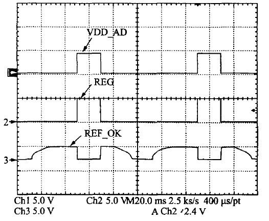 UVLO的啟動電流測量值僅為17.8 A,實現了係統的低啟動電流。係統上電和掉電的測試結果如圖11和圖12所示。可見係統在VDD的設置門限內工作良好,REF-OK可以正確指示各個供電模塊正常工作。掉電過程正好相反。