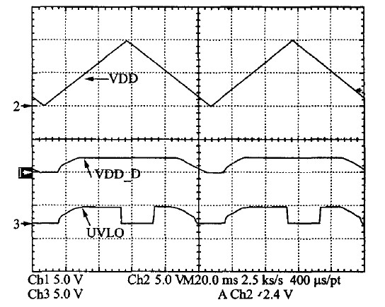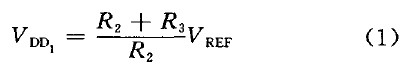 時,比較器跳轉,N1開通,UVLO-out開始變l.通過合理設置R1、R2、R3值就可以使VDD1=9.5 V,VDD2=7V,即VDD上升到9.5 V時UVLO輸出為零,芯片正常工作; VDD下降到7 V 時芯片停止工作。