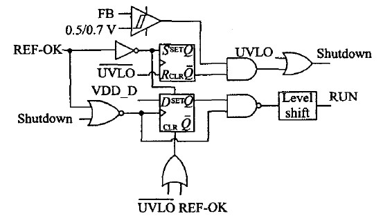 模式控製邏輯用以保證在進行模式選擇時,電源係統正常工作。當FB電壓底於0.5 V時,該控製邏輯通過內部電流滯回比較器自動選擇進入待機模式。RUN信號(其為高電位有效)用來關斷綠色多模式反激變換器中的其它控製模塊,以實現低待機功耗。