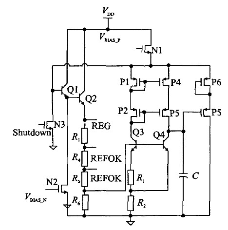 圖中利用帶隙基準電壓加上四個二極管連接的三極管產生一個大於4 V 的電壓,然後經過M0S管產生一個大約2.65 Vzuoyoudedianya。zhegedianyazaijizhundianyajianlihoujiuchanshengle,zhuyaoyongyuweiqianyasuodingdianludeshuzibufengongdian,bingqiedanrenleweizhenggexitongdeshuzidianlugongdianderenwu。