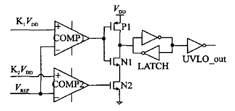 圖2給出第一種欠壓鎖定電路的原理圖,稱為U-VLO1,這是用兩個比較器實現的欠壓鎖定電路。VDD是外部供電電壓源,K1、K2 是小於1的常數,且K1>K2,VREF為1.25 V帶隙基準電壓,LATCH是由兩個反相器組成的鎖存器。圖中標的UVLO_out代表欠壓鎖定信號,狀態設置是UVLO_out=0時有效。