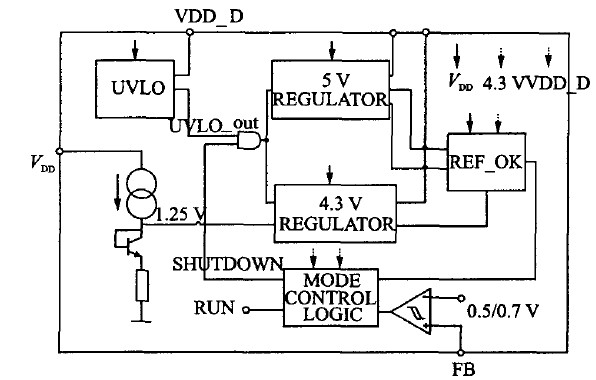 整個係統的構成如圖1所示。係統中包括一個欠壓鎖定電路(UVLO,Under voltage lockout),用於保證電路在合適的電壓範圍內正常工作;一個帶隙基準電壓源和一個專為數字模塊供電的電壓源(記為VDD_D),分別為芯片提供基準偏置和數字部分的電源。具體構成時此兩模塊包含在UVLO模塊內。兩個電壓調整器(REGULATOR)分別產生一個5 V和一個4.3 V 的穩定電壓,其中5 V穩定電壓源輸出記為REG,用於在重載時為控製器供電(輕載時關斷);4.3 V 穩定電壓源輸出記為VDD_AD,用於輕載時的供電。當然,必要時還可以利用帶隙基準產生更多不同的電壓以滿足複雜控製模式的需要。