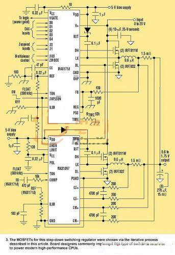 圖3所示CPU內核電源在40A提供1.3V。兩個同樣的20A電源在300kHz運行,提供40A輸出電源。MAX1718主控製器驅動一個,而MAX1897從控製器驅動另一個。該電源輸入範圍在8~20V之間,指定封裝的最高工組作環境溫度60°C。