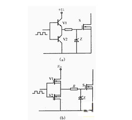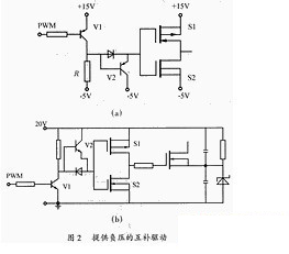 功率MOSFET屬於電壓型控製器件,隻要柵極和源極之間施加的電壓超過其閾值電壓就會導通。由於MOSFET存在結電容,關斷時其漏源兩端電壓的突然上升將會通過結電容在柵源兩端產生幹擾電壓。常用的互補驅動電路的關斷回路阻抗小,關斷速度較快,但它不能提供負壓,故其抗幹擾性較差。為了提高電路的抗幹擾性,可在此種驅動電路的基礎上增加一級由V1、V2、R組成的電路,產生一個負壓,電路原理圖如圖2(a)所示。