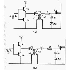 圖1(a)為常用的小功率驅動電路,簡單可靠成本低。適用於不要求隔離的小功率開關設備。圖1(b)所示驅動電路開關速度很快,驅動能力強,為防止倆個MOSFET管直通,通常串接一個0.5~1Ω小電阻用於限流,該電路適用於不要求隔離的中功率開關設備。這兩種電路結構特簡單。