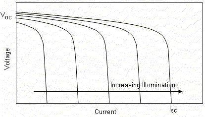 圖2所示為太陽能電池的輸出特性,由於二極管的I-V特性存在微小的變化,串聯電阻(Rs)上shang的de電dian壓ya降jiang也ye存cun在zai微wei小xiao的de變bian化hua,但dan是shi,輸shu出chu電dian壓ya保bao持chi很hen大da的de恒heng定ding。然ran而er,在zai一yi些xie點dian通tong過guo內nei部bu二er極ji管guan的de電dian流liu是shi如ru此ci之zhi小xiao,以yi至zhi於yu它ta變bian得de偏pian置zhi不bu夠gou,並bing且qie,隨sui著zhe負fu載zai電dian流liu的de增zeng加jia,跨kua越yue它ta的de電dian壓ya快kuai速su減jian少shao。最zui後hou,如ru果guo所suo有you產chan生sheng的de電dian流liu流liu過guo負fu載zai並bing且qie不bu流liu過guo二er極ji管guan的de話hua,輸shu出chu電dian壓ya就jiu為wei零ling。該gai電dian流liu被bei稱cheng為wei太tai陽yang能neng電dian池chi的de短duan路lu電dian流liu(ISC),它與VOC一道是定義工作性能的主要參數之一。因此,太陽能電池被認為是“電流受限”的電源。當輸出電流增加的時候,其輸出電壓降低,直到最終減少為零,如果負載電流達到其短路電流的話。