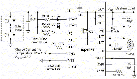 從這個太陽能板獲得的最大輸出電壓(VOC)通常在5.5V到6V之間。因為該電壓低於預設的6V輸出調節電壓,MOSFET Q1被完全關閉。如果係統和電池充電器所需要的總電流超過太陽能電池的輸出電流—取決於光線強弱—能力,太陽能板的輸出電壓將下跌,從而使輸出電壓(VOUT)下降。當VOUT下降到VDPPM—也是太陽能板的輸出電壓—的時候,充電電流就下降了。太陽能板現在將在接近其MPP的狀態下工作,如果VDPPM被設置為接近MPP的話。通過恰當地把RDPPM編程到一個電平,就容許VOUT保持在最小的4.5V,從而實現這一點。這個VDPPM數值就被人們所采用,因為它相當符合太陽能板的MPP。