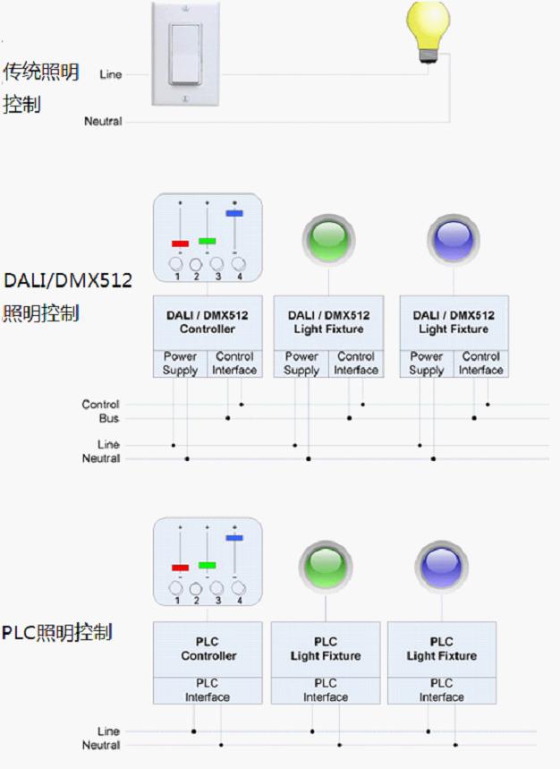 PLC也常應用於照明控製。在傳統照明應用中,。傳統照明架構允許獨立地控製某個燈,而建立在總線拓撲上的標準支持獨立地控製多個燈;雖然DALI和DMX512可以從一個控製器獨立地控製多個燈,但DALI和DMX512都要求安裝額外的控製線。