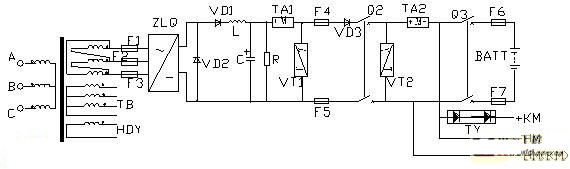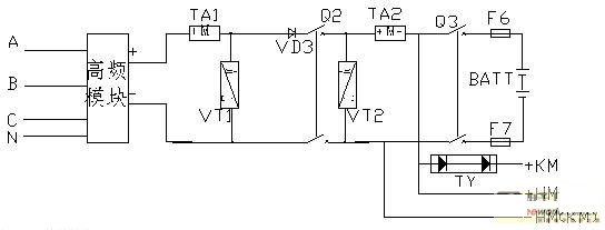 圖中VD3的作用是一個逆阻二極管,防止外部電源倒灌充電機。二極管後邊的開關就是充電機輸出開關。從這裏出去的直流分為三路:一路去電池,一路去動力合閘母線,另一路為控製母線提供前級電源。