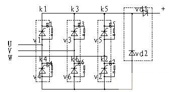 隨著現代集成技術的發展,功率大、體ti積ji小xiao的de可ke控kong矽gui模mo塊kuai取qu代dai了le原yuan來lai的de單dan元yuan可ke控kong矽gui,一yi般ban一yi個ge橋qiao臂bi是shi一yi個ge可ke控kong矽gui模mo塊kuai,三san個ge可ke控kong矽gui模mo塊kuai組zu成cheng一yi個ge三san相xiang全quan控kong橋qiao,再zai加jia上shang一yi個ge有you續xu流liu二er極ji管guan和he隔ge離li二er極ji管guan組zu成cheng的de二er極ji管guan模mo塊kuai,就jiu組zu成cheng了le充chong電dian機ji的de整zheng流liu部bu分fen(見圖2),虛線框內表示為一個模塊。照下麵的接線方式,可控矽的觸發順序為V1、V2、V3、V4、V5、V6。