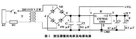 變壓器整流電路和穩壓電源電路(如圖2虛線左邊所示),其主要由變壓器、二極管橋式電路、電容構成。其中變壓器采用常規的鐵心變壓器,並將公共電網中的220 V交流電變為12 V交流電,再通過二極管橋式電路進行整流和電容C1濾波。整流信號由VC1引出。在此基礎上再接三端穩壓器CW7812及電容C3、C4(如圖2虛線右邊所示),這樣整個電路就構成穩壓電源電路。由B點提供+12 V的直流電壓。