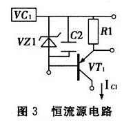 如圖3所示,由穩壓管VZ1、晶體管VT1、電阻R1、電容C2構成的晶體管電流源提供恒定電流,取穩壓管電壓為5 V,R1為51 Ω,此時IC≈1OO mA,作為電路的充電電流。