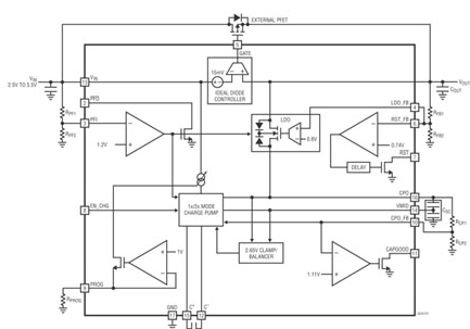 任何可高效地滿足上述小到中電流超級電容器充電器 IC 設she計ji限xian製zhi的de解jie決jue方fang案an都dou會hui包bao括kuo一yi個ge麵mian向xiang兩liang節jie串chuan聯lian超chao級ji電dian容rong器qi和he基ji於yu充chong電dian泵beng的de充chong電dian器qi以yi及ji自zi動dong容rong量liang平ping衡heng和he電dian壓ya箝qian位wei。淩ling力li爾er特te已yi經jing為wei這zhe類lei應ying用yong開kai發fa出chu了le一yi個ge簡jian單dan但dan尖jian端duan的de單dan片pian超chao級ji電dian容rong器qi充chong電dian器qi IC,該 IC 不需要電感器,也不需要平衡電阻器,提供了反向隔離,並有多種工作模式,而且靜態電流還很低。