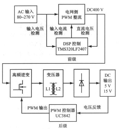 該種高功率因數開關電源設計方案采用PWM整流技術和DSP技術,能數字化地實現整流器網側單位功率因數正弦波電流控製,比較適合應用於中等功率開關電源設計中。
