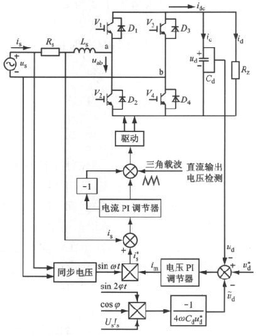 單相全橋電壓型PWM 整(zheng)流(liu)器(qi)選(xuan)擇(ze)響(xiang)應(ying)速(su)度(du)較(jiao)快(kuai)的(de)三(san)角(jiao)波(bo)電(dian)流(liu)比(bi)較(jiao)法(fa)作(zuo)為(wei)控(kong)製(zhi)策(ce)略(lve)。因(yin)反(fan)饋(kui)到(dao)電(dian)壓(ya)外(wai)環(huan)的(de)輸(shu)出(chu)電(dian)壓(ya)含(han)有(you)紋(wen)波(bo)電(dian)壓(ya),而(er)紋(wen)波(bo)電(dian)壓(ya)的(de)存(cun)在(zai)將(jiang)導(dao)致(zhi)電(dian)流(liu)內(nei)環(huan)的(de)給(gei)定(ding)電(dian)流(liu)發(fa)生(sheng)畸(ji)變(bian),因(yin)此(ci)本(ben)文(wen)采(cai)用(yong)補(bu)償(chang)輸(shu)出(chu)直(zhi)流(liu)電(dian)壓(ya)中(zhong)紋(wen)波(bo)電(dian)壓(ya)的(de)方(fang)法(fa)[4]來減少流入電壓控製環的紋波電壓,從而改善給定電流的波形。按照以上原理設計的單相全橋電壓型PWM整流器的控製係統結構如圖4所示。