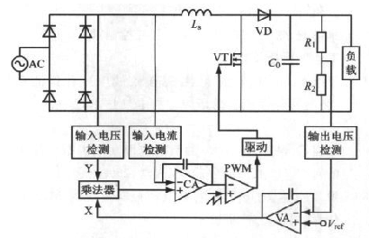 工作原理:APFC主電路的輸出電壓經電阻分壓後與基準電壓相比較,誤差值輸入到VA;VA 輸出信號X與輸入電壓檢測信號Y一起輸入乘法器,經過平均化處理、放大、比較後,再經過PWM 比較器加到柵極驅動器,產生對開關管VT的控製信號,從而使電感Ls上的電流(即輸入電流)平均值始終跟蹤模擬乘法器輸出的半正弦信號,即跟蹤了輸入電壓波形,並實現了輸入電流正弦化,使功率因數接近1,達到校正功率因數的目的。