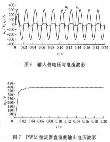 交流輸入側電壓與電流的仿真波形如圖6所示,可見交流側電流、電壓能始終保持同相,且電流能實現正弦化。直流側輸出電壓波形如圖7所示,可見0.06s後輸出電壓穩定在400V左右。