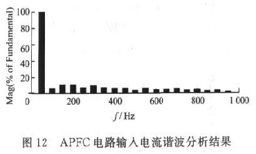 單相APFC電路采用Matlab7.6進行建模與仿真。圖10為APFC電路輸入電壓和電流波形,可見網側輸入電流由窄脈衝波形變成正弦電流波形,且與輸入電壓同相位。圖11為APFC電路輸出電壓波形,可見經過60ms的軟啟動過程之後,輸出電壓穩定在400V左右,滿足設計要求。圖12為APFC電路輸入電流諧波分析結果,可見除基波外,其餘諧波含量均很小。