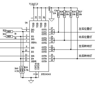 BTS5434G可以利用其電流傳感使能(Sense Enable)功能,將多個BTS5434G的電流傳感輸出信號采用“線與”的方式,最終由MCU的兩個AD口進行處理,可以有效地節約MCU資源並省去多路檢測電阻。如圖4所示,在實際應用中,還使用了一路開關在待機狀態下將所有的用於自動檢測負載開路的上拉電阻斷開,更進一步降低了待機功耗。