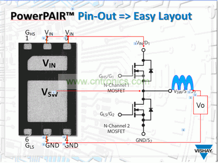 這種器件的另一個好處是布線。從圖2中可以看到,封裝的引腳使其能很容易地集成進降壓轉換器設計方案中。更特殊之處在於,器件的輸入是在一側,輸出在另一側。引腳2和3與DC-DC電路的VIN相對應,是高邊MOSFET的漏極。小焊盤也是高邊元器件的漏極焊盤。較大的焊盤是電路的開關節點的焊盤更大,在這個地方,高邊MOSFET的源極合低邊MOSFET的漏極在內部連到器件上。這個節點會連到電感器。最後,接地是引腳4和5,是低邊MOSFET的源極。引腳1和6 分別連到高邊和低邊MOSFET的柵極。這種布線很簡單,而且減少了用兩個器件時發生布線錯誤的幾率。把多個器件組合在一起時需要額外的PCB走線,這種布線還能減少與此種PCB走線相關的寄生電感: