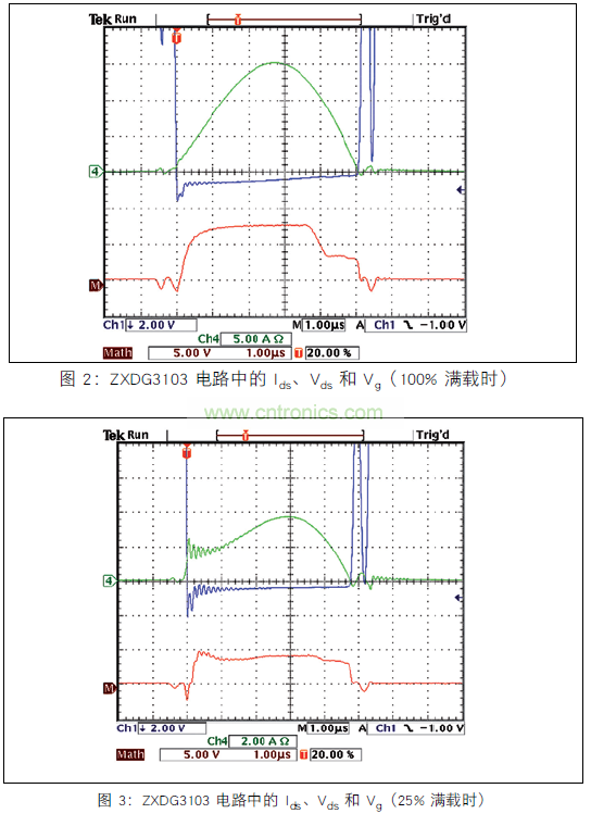 在滿載測試電路中,柵極驅動電壓在正弦電流開始減少時早期終止,這可能是由電路的電感和 Q1 TO-220 封裝的電感造成的。 與前麵使用 ZXGD3103 的測試一樣,對布局進行改進、減少阻抗和選擇低電感的封裝應該可以解決此問題。