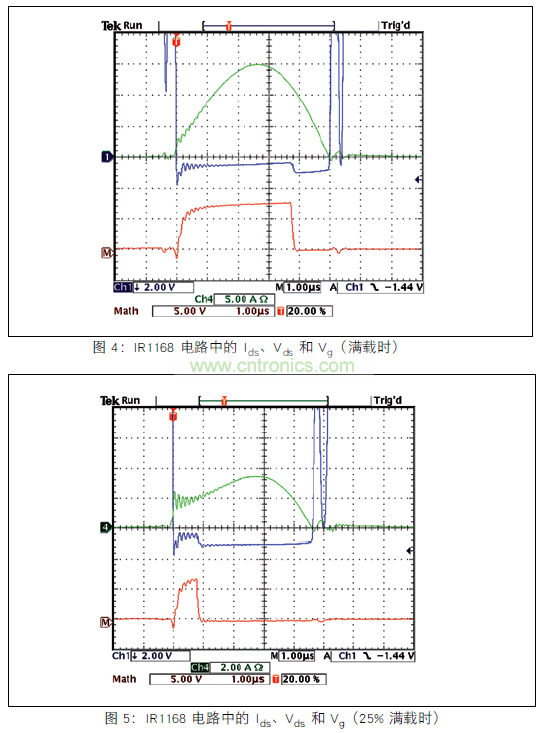 在這兩個圖中,令人關注的是快速柵極驅動電壓。在探測到寄生二極管在 MOSFET 中的正向壓降之後約 200 納秒內,Q1 打開,減少其電壓 (Ch1 - Vds)。 在這兩個測試中,Q1 Vds 均高於預期。 這可能由電路電感和示波器的容量造成的。在滿載情況下,柵極驅動電壓在正弦電流開始減少時下降。這可能是電路的電感和 Q1 TO-220 封裝的電感造成的。對布局進行改進並選擇低電感的封裝應該可以解決此問題。