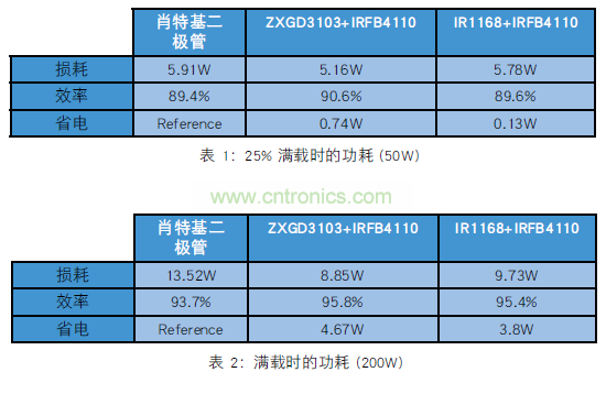 總之,隨著 ZXGD3103 和 IR1168 的麵市,在 LLC 電路的輸出階段實施同步整流有望變得切實可行。 這種新技術似乎在 25% 滿載至 100% 滿載的範圍內都可以實現電源節省。