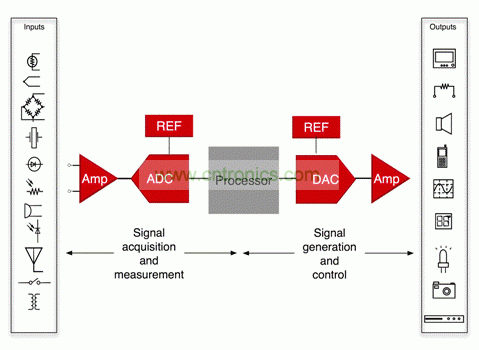 圖 1 所示結構圖可代表信號處理的所有係統。如果它是一個測量或者數據采集係統,則信號鏈開始於傳感器,經過信號調節電路,進入一個 ADCr,然後結束於處理器。如果它是一個控製係統、一個音頻處理係統亦或是一個軟件定義無線電設備則可能存在一些必須變回到模擬信號的處理器輸出;這種情況顯示在結構圖的右手側二分之一處。