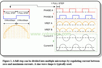 圖 1 通過調節零和最大電流之間的電流,我們可以將一個全步分成多個微步。一般會使用一個正弦波形。