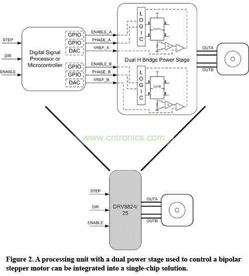 圖 2 具有雙極步進馬達控製用雙功率級的一個處理單元,可以集成到一個單片解決方案中。