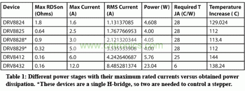 但是,利用更大的功率級,可以讓RDSon變得更小。這便是DRV8825的工作原理。0.64歐姆高端到低端的RDSon最大時,可以讓芯片溫度保持更低的同時提供更多的電流。如果使用了更大的功率級,且RDSon參數越來越小,則有望獲得更大的電流容量。表1顯示了使用不同器件時的各種電流容量。