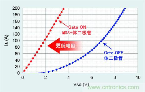 一般Si-IGBT元件無法逆向導通,而SiC-MOSFET可通過體二極管實現常時逆向導通。另外,通過輸入柵極信號,還可實現MOSFET的逆向導通,與二極管相比,可實現更低電阻。通過這些逆向導通特性,與二極管整流方式相比,可在1000V以上的範圍采用高效同步整流方式的技術。