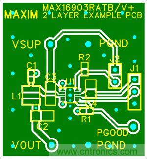 針對開關穩壓器MAX16903(圖9)外圍元件的合理布局,有助於從源頭降低噪聲和電磁輻射,有助於節約項目評估階段的寶貴時間,簡化設計。