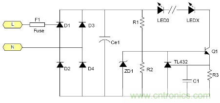 C1為降壓電容器, D1, 2, 3, 4為橋式整流二極管, ZD1是穩壓二極管, R1為關斷電源後C1的電荷泄放電阻。