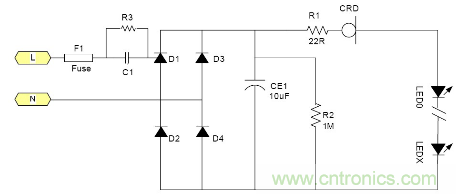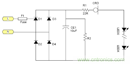 由於恒流二極管需要一定的電壓Vk才能夠進入恒流, 所以太低的電源電壓是無法工作的。通常這個Vk大約在5-10V左右 所以大多數采用電池供電的LED是無法工作的, 最大電流由於恒流二極管的功耗受到限製, 所以過大的電流也是不合適的。例如1W的LED通常需要350mA, 恒流二極管就很難提供, 目前比較合適的使用場合就是交流市電供電的LED燈具采用很多小功率LED串聯也就是高壓小電流的情況是最為合適;但是由於恒流二極管的耐壓有一定的限製 所以它所能吸收的電源電壓變化也是有限的。就拿100V耐壓的CRD來說用在220V市電電源裏都還隻能對付有限的電壓變化。220V經過橋式整流以後它的輸出直流電壓大約為264V.如果市電變化+10% ~-15%就相當於整流後為290~187V, 電壓變化103V.已經超過其耐壓了。因為LED伏安特性的非線性 所以很難用公式來表示。總之當市電電壓降低時LED中的電流就會隨市電電壓的降低而降低。其亮度也會跟著變。 典型應用電路中圖3為典型的應用電路, 圖4為加了阻容降壓的應用電路為了應對低電壓的輸出場合。