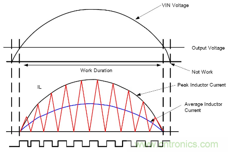 在半個輸入電壓周期內, 控製TON固定, 則電感電流峰值跟隨輸入電壓峰值, 且相位相同, 實現高功率因素PF, 有如下等式: